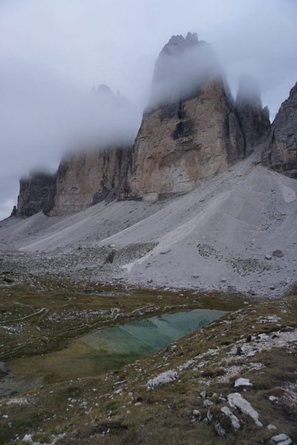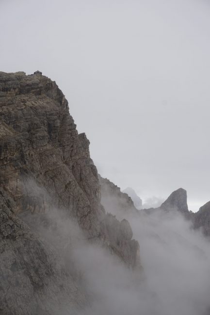 Descendemos hasta el refugio Locatelli, donde vemos las famosas Tre Cime di Lavaredo…o mejor dicho no vemos, pues la niebla las cubre. Decidimos esperar a ver si despeja tomando un café y un pedazo de tarta, con la compañía de los grajos. Hace un frío del … 🙂