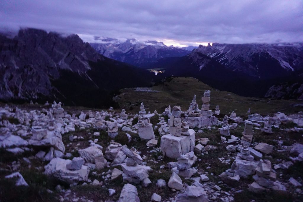 Regresamos al refugio Auronzo por el sendero 105, con vistas de las Tre Cime siempre de frente, apareciendo y ocultándose entre la niebla, en un ambiente violáceo al caer el sol.