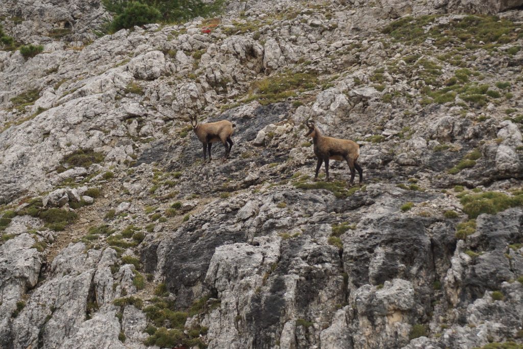 Dejamos el coche en el refugio Col Gallina y tomamos el sendero 419 a través de un bello bosque hasta llegar al lago di Limides. Continuamos ascendiendo por un escarpado sendero, con los ibex cruzándose en nuestro camino hacia el refugio Averau.