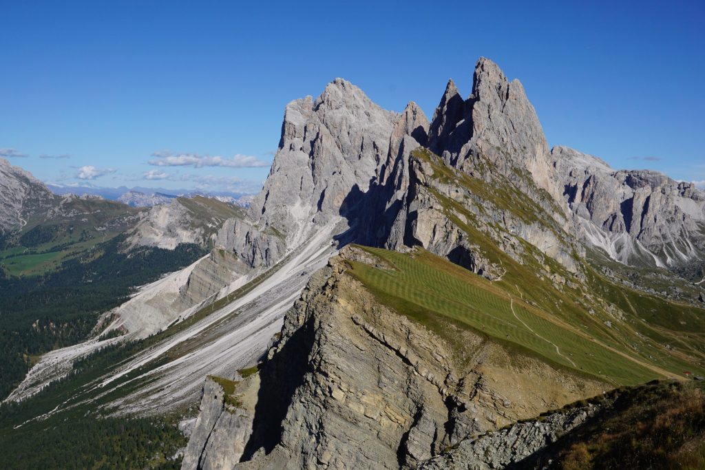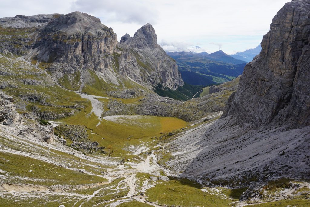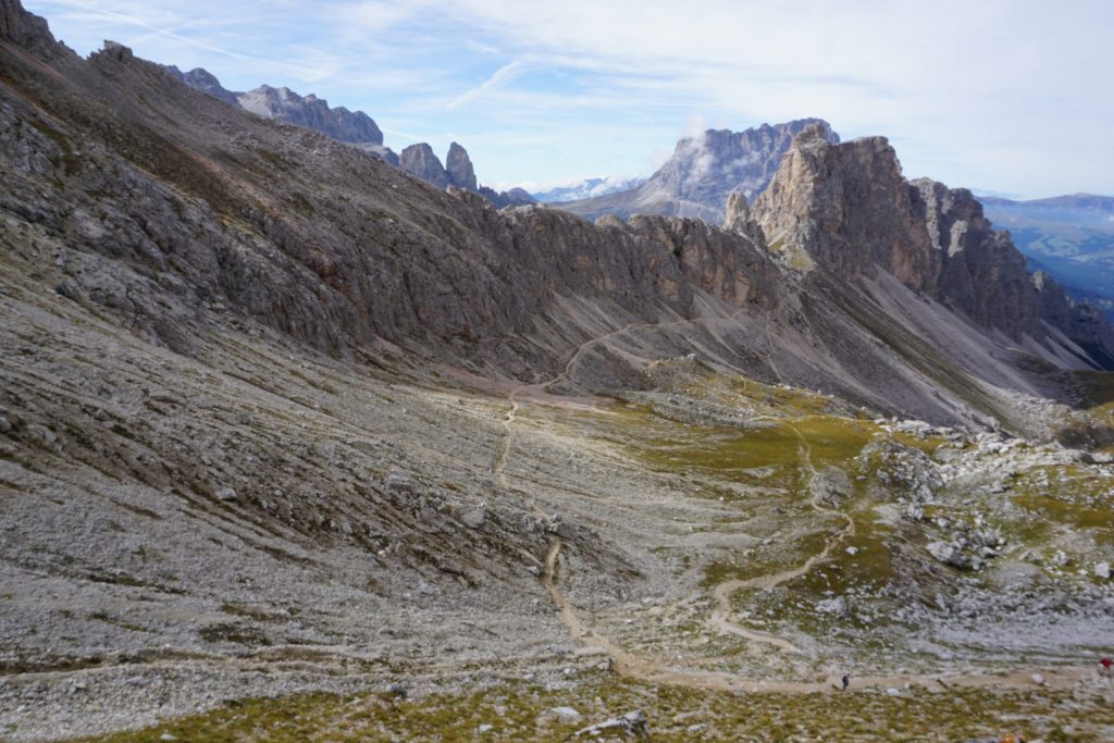 Ascendemos dejando atrás verdes prados y encontrando un rocoso paisaje hasta el refugio Puez, donde paramos a comer. Durante todo el trayecto las vistas son abrumadoras, una auténtica maravilla.