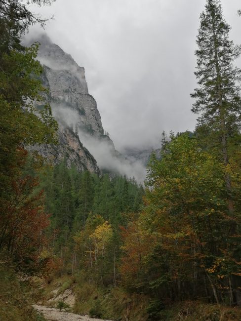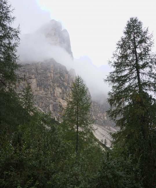 Las nubes empiezan a cubrirlo todo y a llover…así que como no vemos nada, tras alcanzar el refugio Averau decidimos no ascender al refugio Nuvolau. Descendemos entre la niebla pasando por las Cinque Torri hasta que nos adentramos en el bosque donde empezamos a ver algo, ¡ardillas!