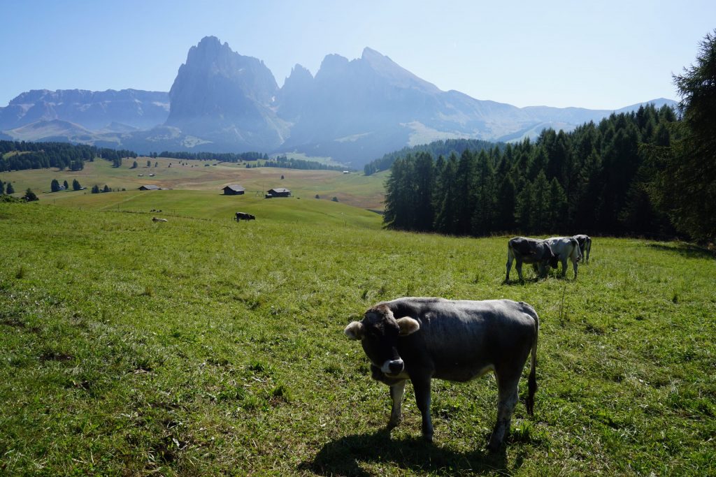 Primero nos dirigimos a Ortisei donde cogemos un teleférico para subir al famoso Seceda. Lo primero que nos encontramos al bajar del teleférico son un montón de vaquitas peludas como las que vimos en Escocia. ¡¿Pero qué hacen aquí estas vaques?!