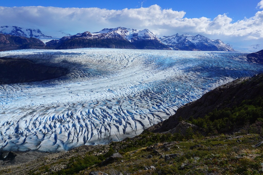 Los primeros kilómetros del recorrido continúan por el interior del bosque magallánico, por un sendero muy embarrado, encharcado y repleto de raíces. Tras abandonar el bosque comenzamos el ascenso hacia el Paso John Gardner (1.200 m). Una sección pedregosa, empinada y con algunos neveros, correspondiente a la zona biótica desierto de altura. Las vistas desde el collado son realmente increíbles: el Glaciar Grey en toda su extensión. Comenzamos el descenso por la morrena, con unas bellísimas vistas que te gustaría quedarte a contemplar durante horas, sin embargo el fuerte viento te empuja a continuar.
