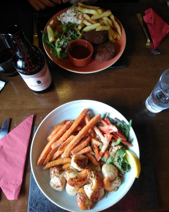 – Mariscos. Vieiras, mejillones, ostras, cigalas… Estaban buenos y eran frescos, especialmente nos gustaron las vieiras, las más grandes que hemos tomado. Pero como nos pasó en Noruega, no sabemos si será por la temperatura del agua, el marisco nos resulta más duro e insípido que el de los países del sur de Europa.