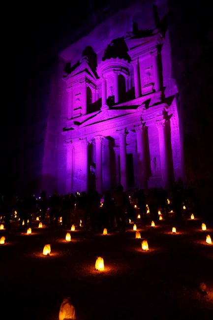 Había tanta gente que parecíamos ovejas apiñadas en un redil, flasheadas por cientos de fotógrafos y con un barullo continuo que impedía disfrutar de la música. Por vuestra seguridad os recomendamos no mirar nunca hacia atrás o los flashes os cegarán de por vida 😀 Además el espectáculo fue muy corto y no tenía ningún encanto. Aunque esto pueda hacerles ganar menos dinero deberían limitar el aforo y prohibir las fotografías durante el espectáculo y una vez finalizado éste, dejar un tiempo para tomar fotografías. Sin duda lo mejor de la experiencia fue caminar por el Siq a oscuras hasta alcanzar el Tesoro.