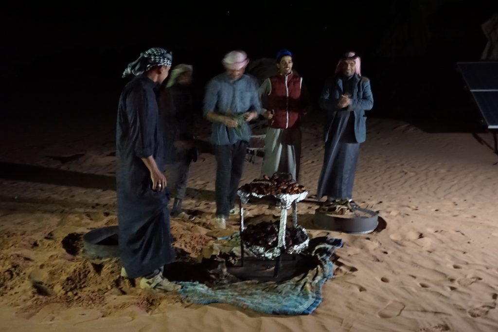 La comida fue fabulosa, uno de los principales motivos por el que nos decantamos a la hora de elegir este campamento era por las buenas críticas en este aspecto. Tuvimos la suerte de probar las dos noches el zarb, un asado típico beduino que se cocina bajo la arena del desierto. Otra de las ventajas de este campamento es que al estar ubicado próximo a la entrada del desierto te permite llegar de noche, que era precisamente nuestro caso. En cuanto a actividades no creemos que sea la mejor opción pero tampoco está mal. No nos gustó que cobraran el agua, pero bien es cierto que puedes tomar libremente y sin límite té. El ambiente/trato del personal no nos gustó, es más bien un trato de negocios, se preocupan de que estés a gusto pero para ganar dinero, nada que ver con la experiencia que vivimos en Feynan. A la hora de pagar aquello parecía una reunión con Don Vito Corleone y sus secuaces jajaja