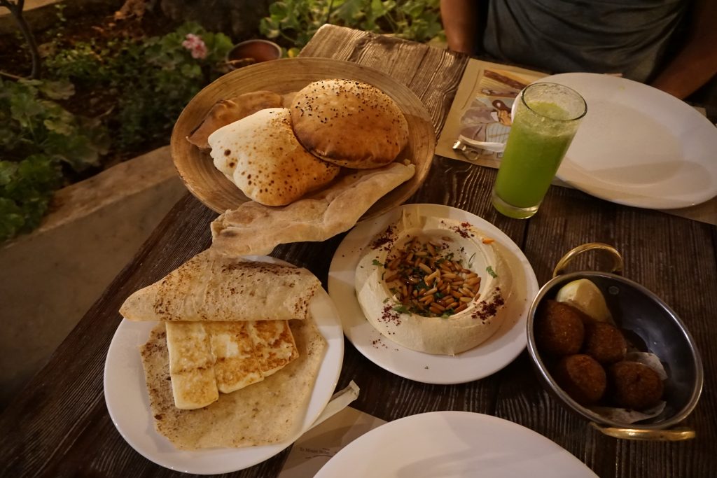 En la mesa lo primero que se sirve es el mezze, varios platitos de entrantes fríos entre los que se encuentra el hummus de garbanzos o el falafel, una especie de albóndigas rebozadas y fritas, también de garbanzo; el baba ganoush, un hummus de berenjena que nos encantó o el kibbeh, una especie de albóndiga con un relleno de carne picada de cordero o ternera envuelta en una masa frita.