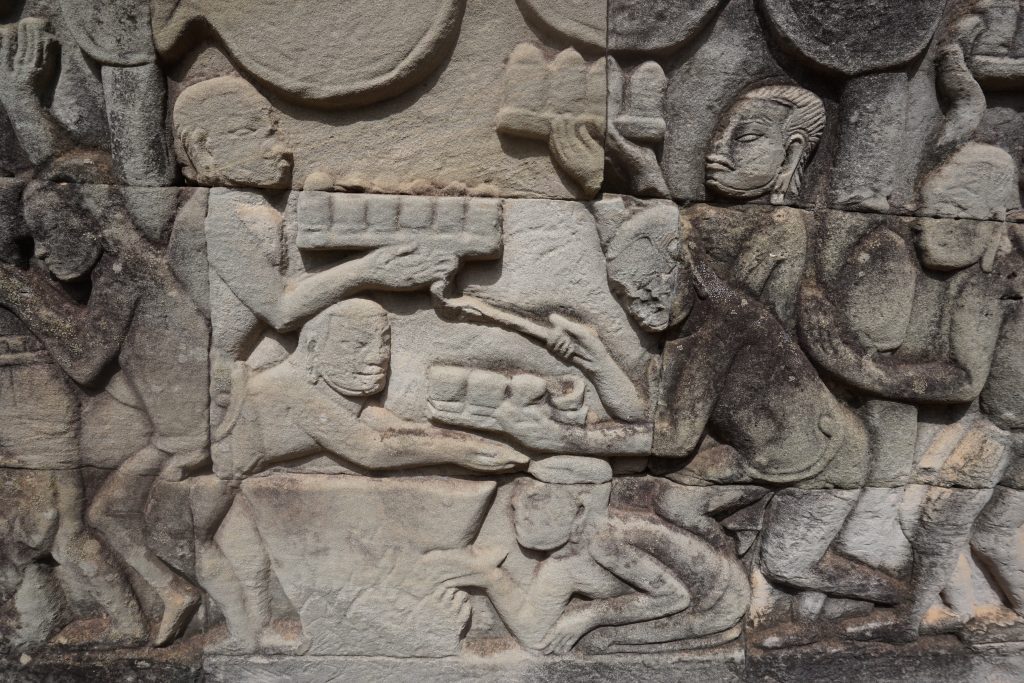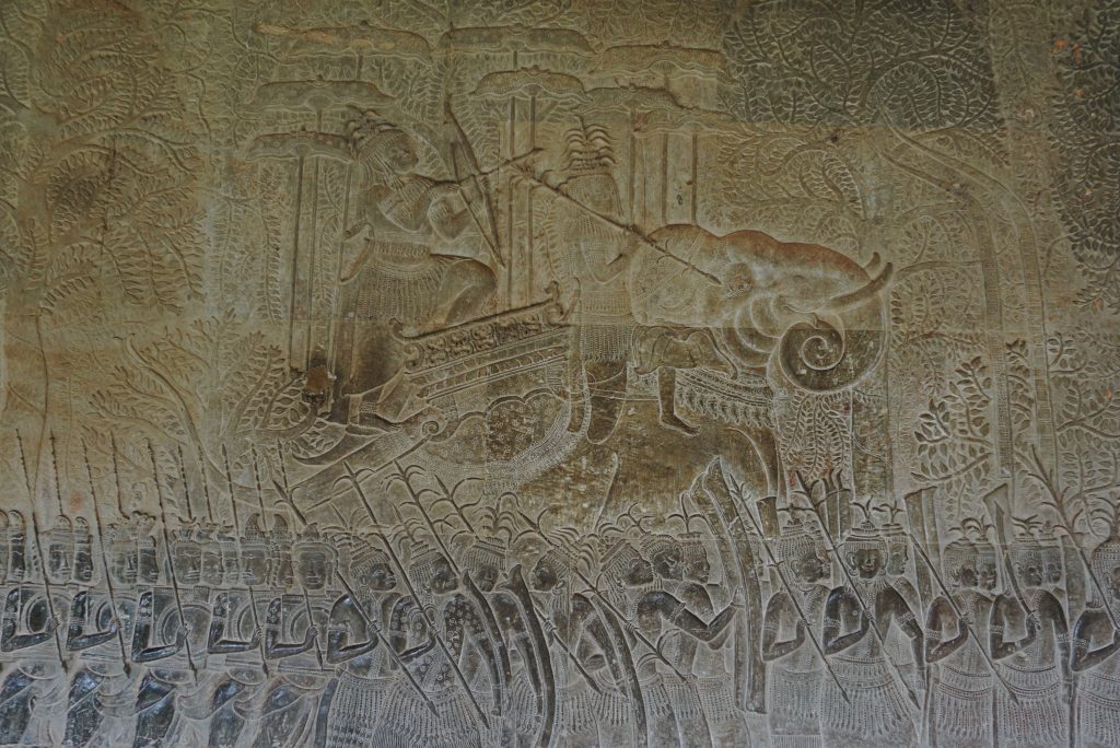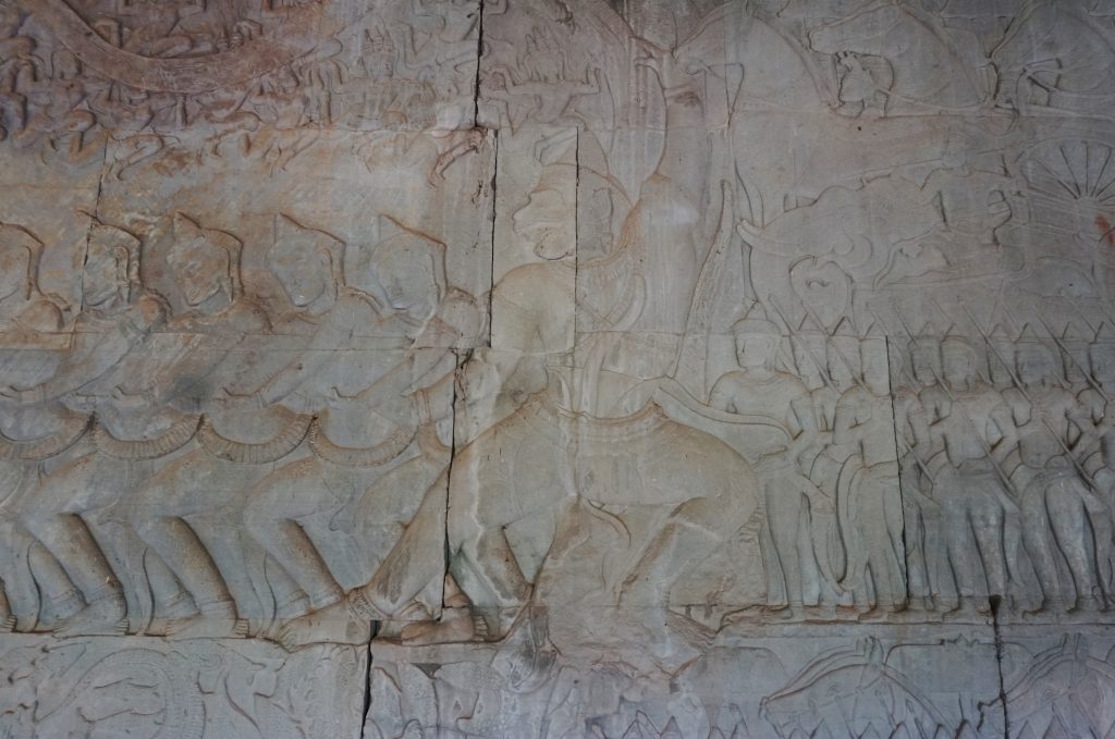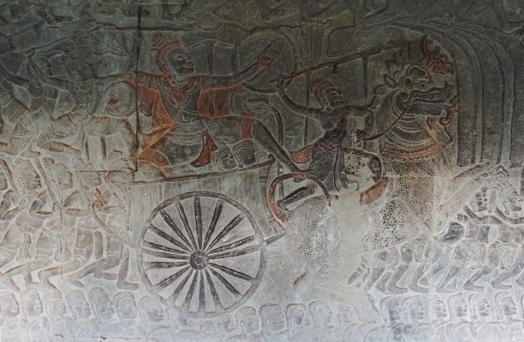 Los paneles muestran también carros de guerra, que curiosamente no eran utilizados por el imperio jemer, dado que el terreno de Angkor Wat es muy irregular.