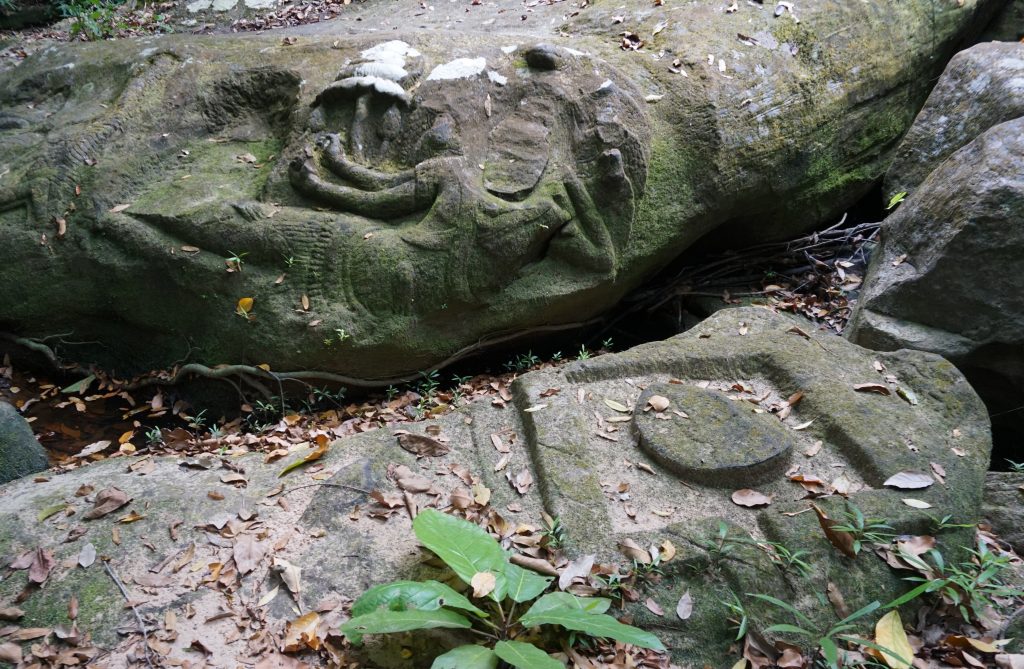 Engullidos por la selva y rodeados de increíbles mariposas encontramos, esculpidas en las piedras del lecho del torrente, divinidades que emergen de las aguas.