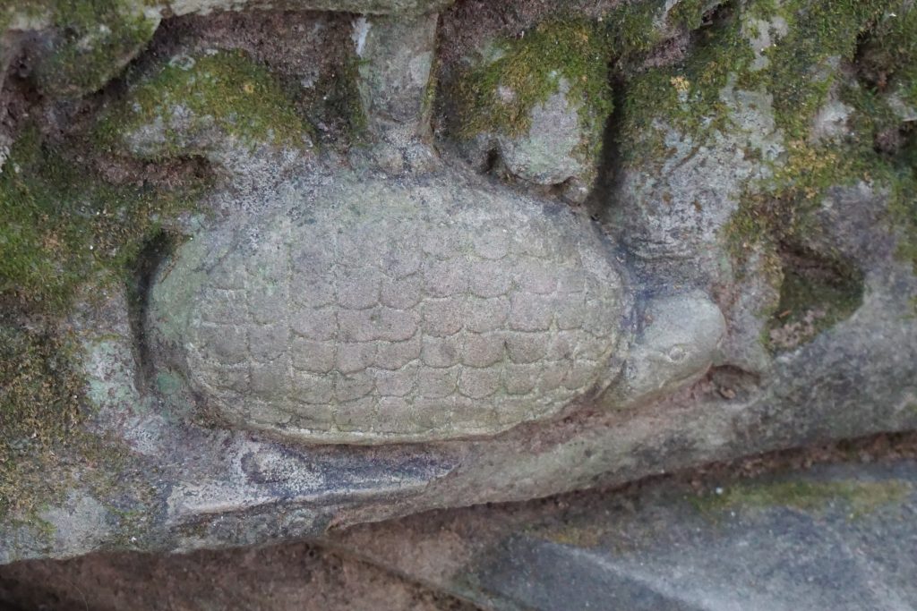 En el detalle del tímpano sobre la puerta de la biblioteca, Ravana el demonio de 1000 cabezas, intenta acabar con la morada de Shiva en el monte Kailash. El poderoso dios permanece impasible en la cima mientras su esposa Parvati, la hija de los Himalayas, lo abraza aterrorizada. Shiva consigue atrapar a Ravana bajo la montaña y lo hace prisionero. Durante mil años Ravana cantó himnos en alabanza a Shiva, quien finalmente lo bendijo y le otorgó una espada invencible.