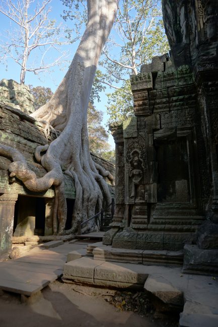 Ta Prohm ha sido conquistado por enormes árboles centenarios, seres que dominan el espacio filtrando la luz del sol y sumiendo al templo en una gris penumbra que le da aún mayor encanto.