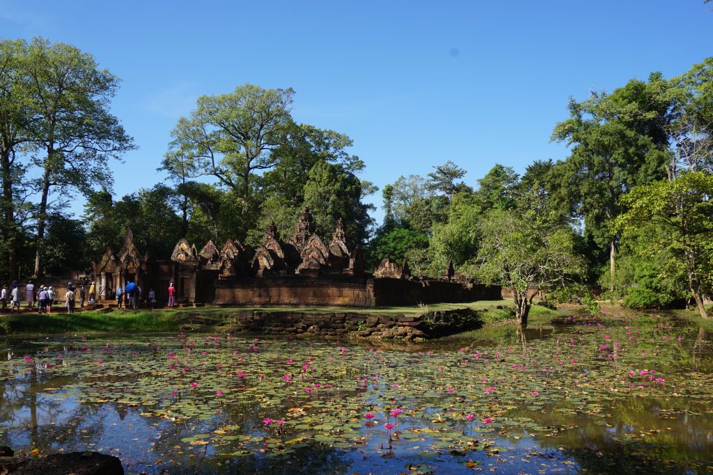 La joya del arte jemer en el que encontramos las más bellas esculturas y decoraciones talladas en la arenisca rojiza. Está rodeado de un hermoso foso con flores de loto que lo hace aún más encantador.