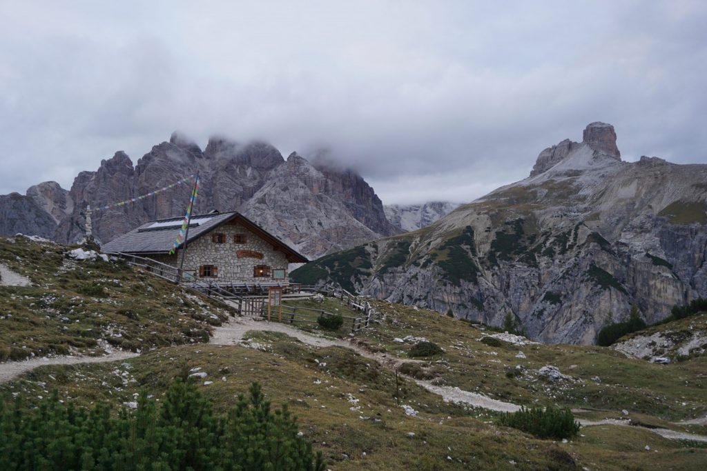 Cruzamos bajo el Monte Paterno y llegamos al refugio Locatelli. Allí aprovechamos para merendar un trozo de tarta y un café con vistas a las Tre Cime di Lavaredo, mientras las nubes bailan cubriéndolas y mostrándolas.
