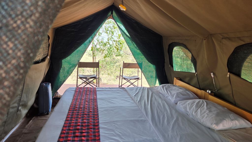 Nos alojamos tres noches con desayuno incluido en una tienda tipo safari con baño compartido. El lugar es maravilloso: la tienda súper confortable, con electricidad y camas; las vistas de la sabana de ensueño, las zonas comunes muy limpias y bonitas, el personal encantador, la comida buena y la relación calidad precio imbatible.
